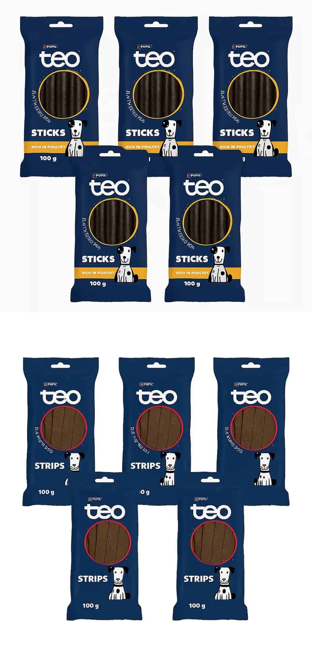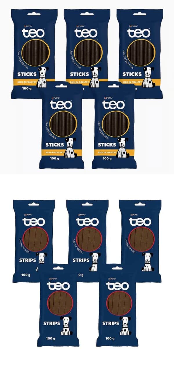Denne praktiske Mix Pakke indeholder 5 poser Teo Sticks og 5 poser Teo Strips – i alt 10 poser med lækre, proteinrige snacks.